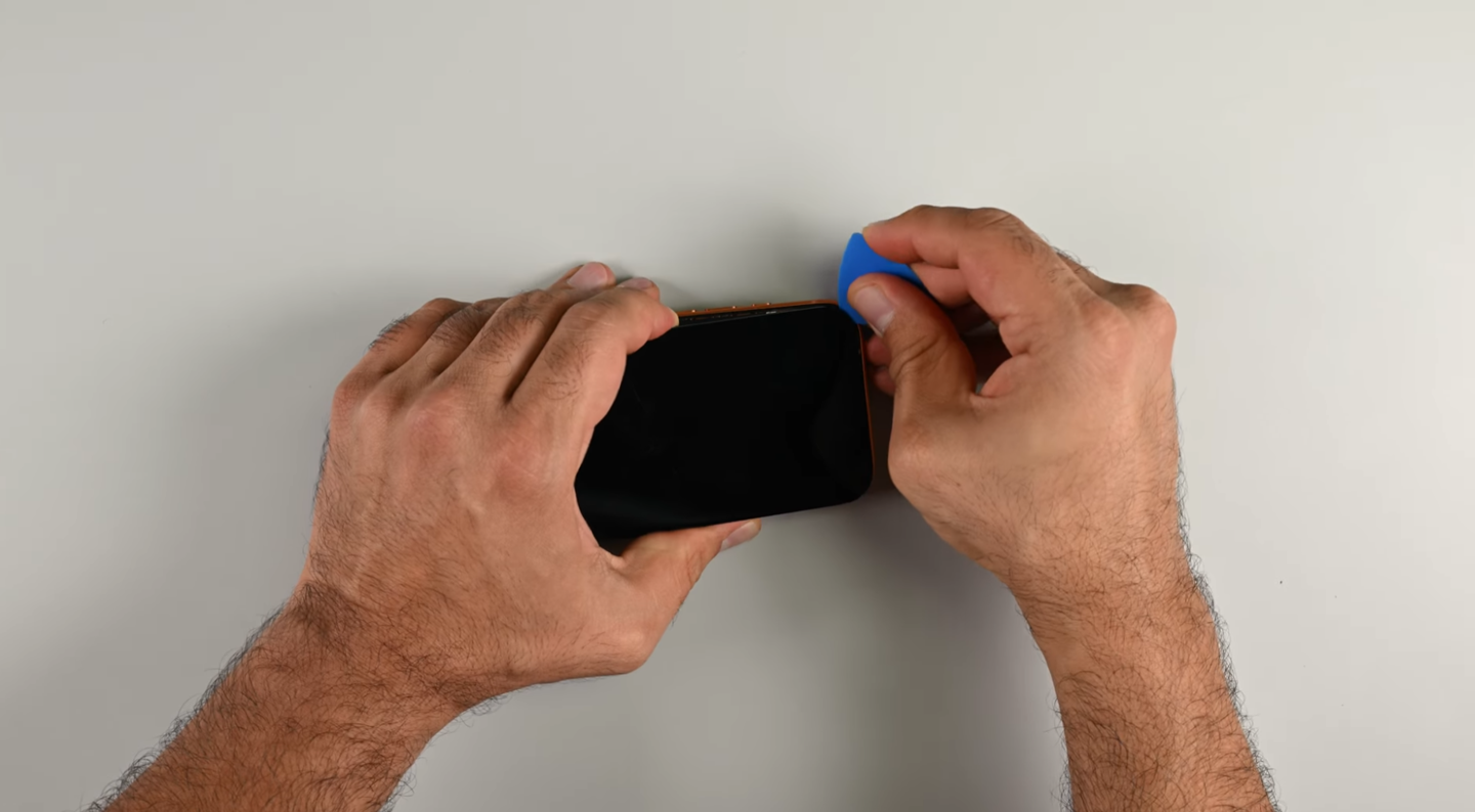 拆解首先从拆后盖开始,维修人员先加热后盖,用吸盘和翘片打开后盖的玻璃部分,打开后只需要拆下一颗螺丝并移除无线充电排线就能将后盖与机身分离。