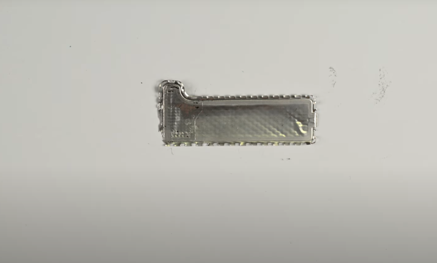 拧下多颗螺丝后,“电池托盘”被取出,这个托盘并不属于中框,只是电池的固定框架,底部有支持快拆技术的粘胶,只需要给底部拉条通上 12V 电就能分离电池粘胶,电池会自动脱落,该电池采用钢壳包裹,具备更强的安全性、稳定性。