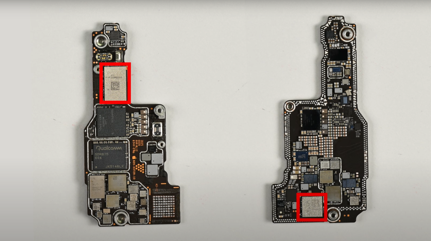 本次 iPhone 17 Pro 的主板还采用了类似堆叠的设计,拆下主板前需要移除后摄模块,同时在取出主板前必须要手动给主板翻面,移除毫米波排线等,主板还是使用双层设计,内部有 A19 Pro 芯片、N1 Wi-Fi 芯片,配有高通基带。