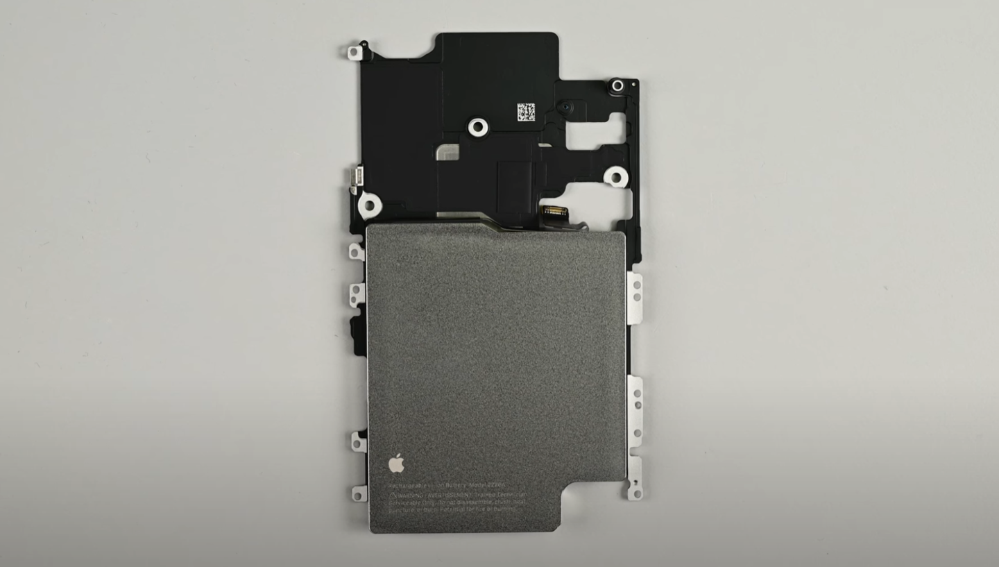 随后维修人员加热屏幕部分,用大吸盘和翘片取下屏幕,取下屏幕排线固定螺丝并断开排线,随后可以看到本代 iPhone 的新设计“电池托盘”,它的体积比电池本身要大,覆盖主板和电池部分,表面有石墨烯涂层。
