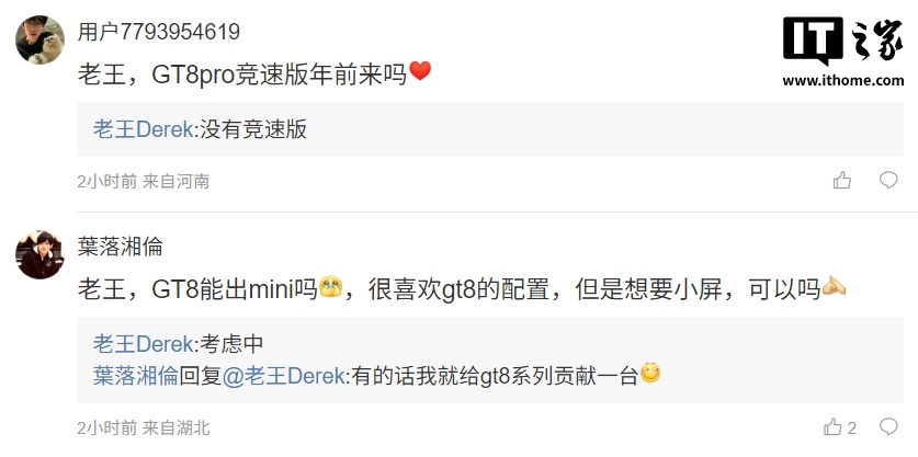 还有网友表示“GT8 能出 mini 吗,很喜欢 gt8 的配置,但是想要小屏,可以吗”,王伟则表示“考虑中”。