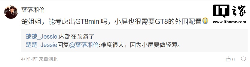 此外,realme 中国区 CMO @楚楚_Jessie 也回应 GT8 mini 请求,并表示“内部在预演了”“难度很大,因为小屏要做轻薄”。