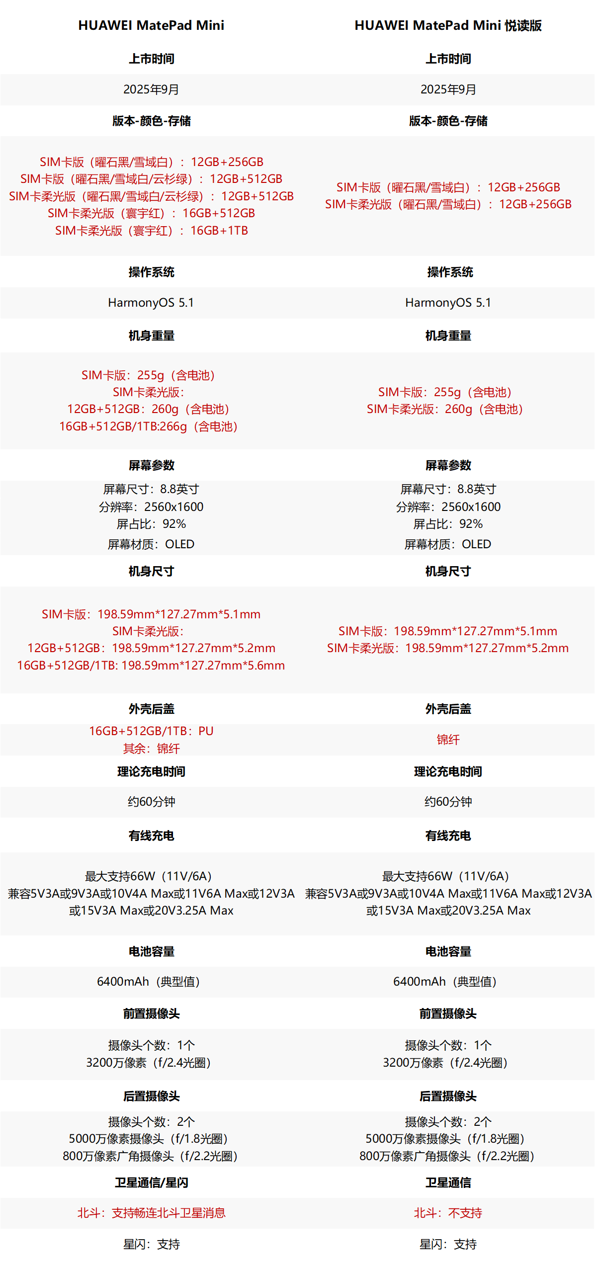 华为 MatePad Mini 系列小平板于 9 月 4 日正式发布,提供常规版和悦读版两个版本。IT之家从华为商城客服处查询获悉,悦读版主要是在外观重量、卫星通信方面和普通版有差异,可选配色更少,不支持北斗卫星消息。此外,悦读版不会在官方商城、授权电商售卖,仅供华为体验店、授权零售商。