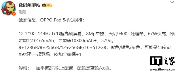 9 月 12 日,博主 @数码闲聊站 曝光 OPPO Pad 5 核心规格,并称一加平板 2 也是同样配置,配色是蓝色 / 灰色。