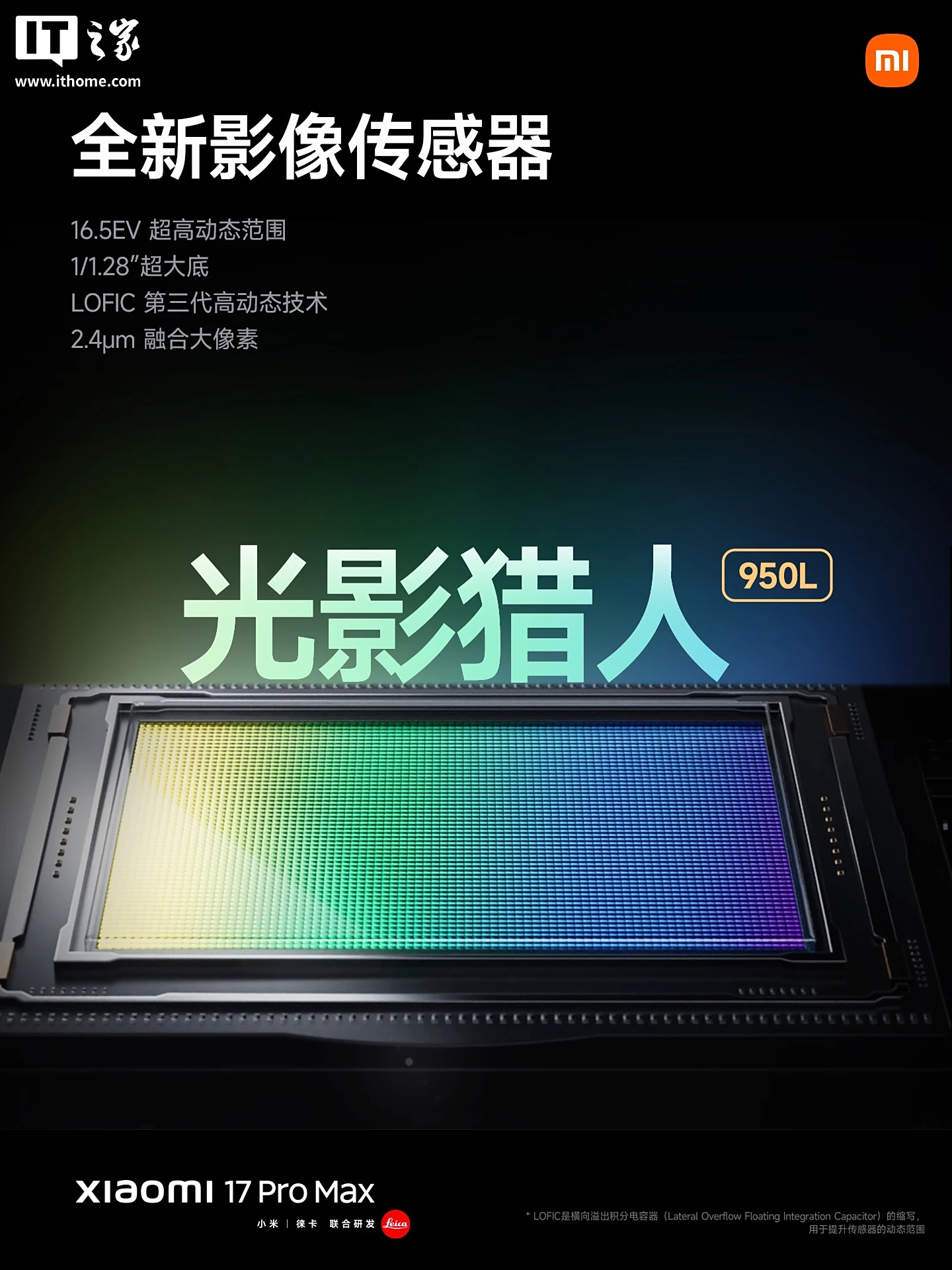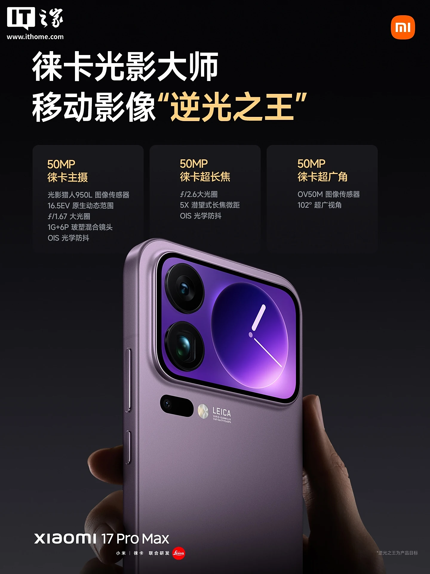 小米 17 Pro Max 采用全新「徕卡光影大师」影像系统,徕卡光学专业三摄,号称移动影像“逆光之王”,主摄搭载全新影像传感器,光影猎人 950L,全新 LOFIC 高动态技术,16.5EV 超高动态范围;搭载 5X 大底潜望长焦,进光量提升 30%。