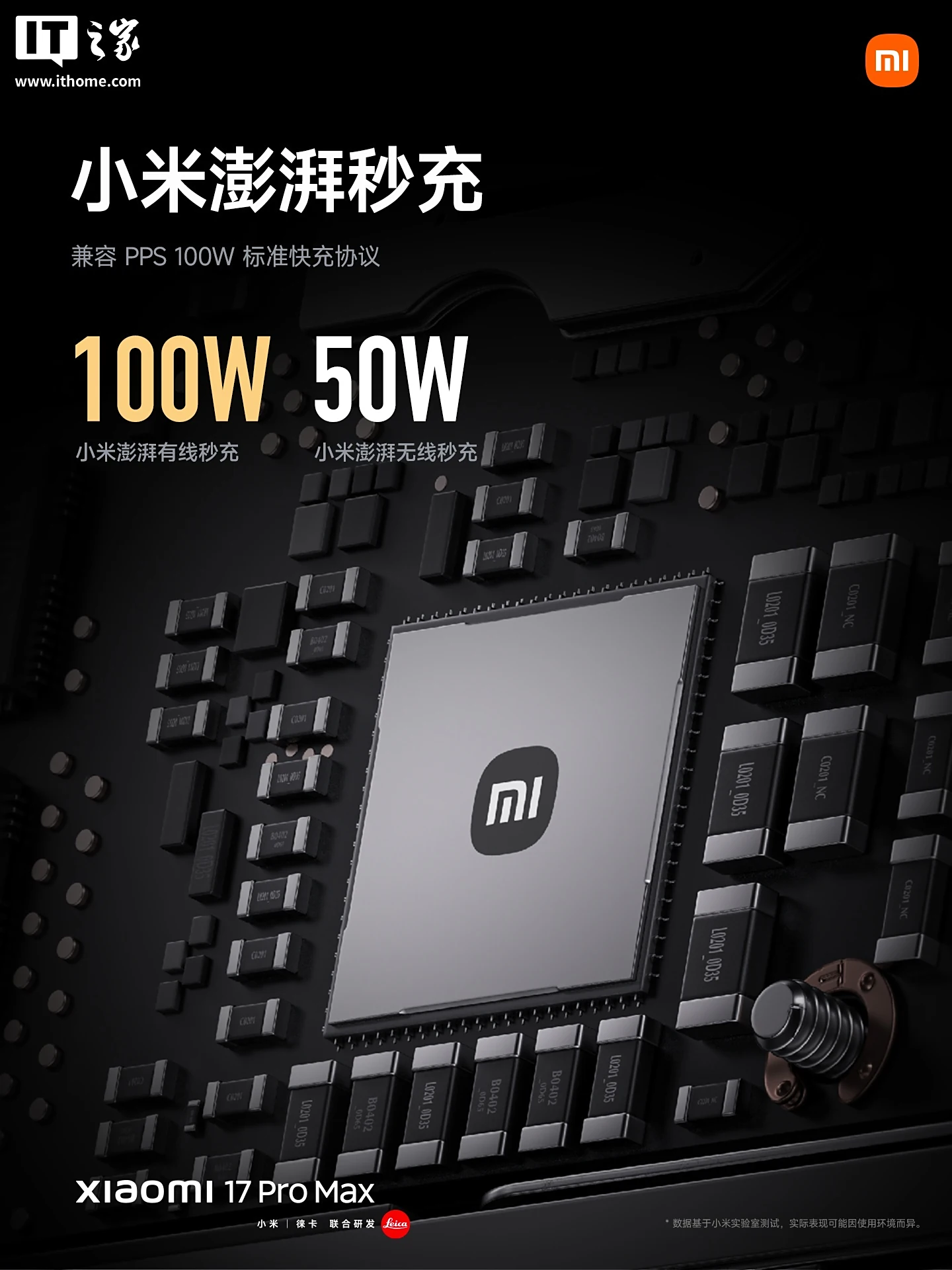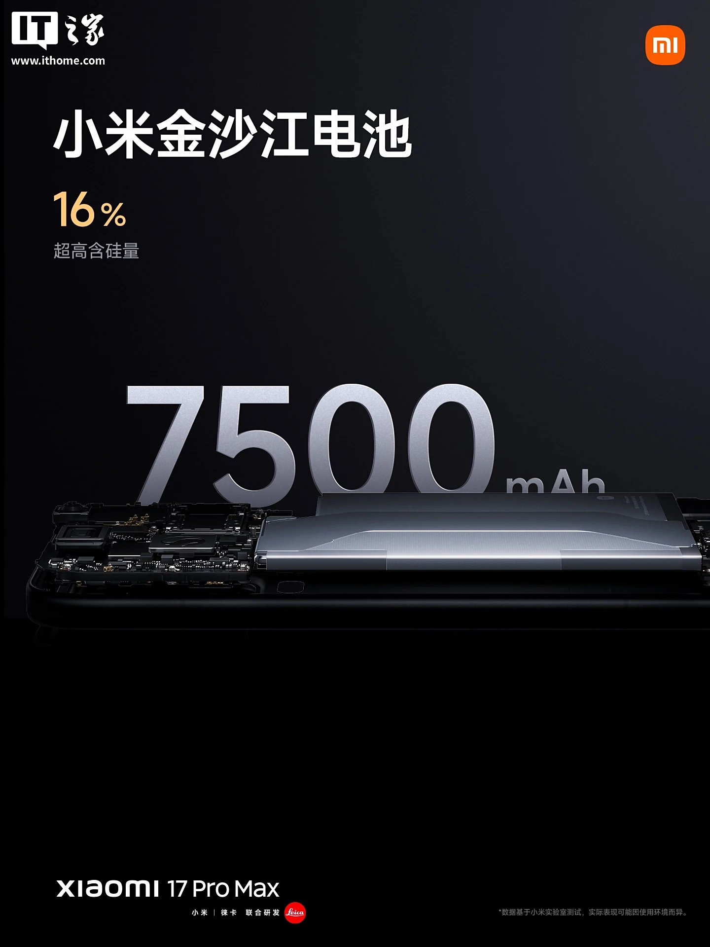 小米 17 Pro Max 搭载 7500mAh 超大小米金沙江电池,采用 L 形封装异形叠片电池技术,16% 含硅量,支持 100W 小米澎湃有线秒充、50W 无线秒充。