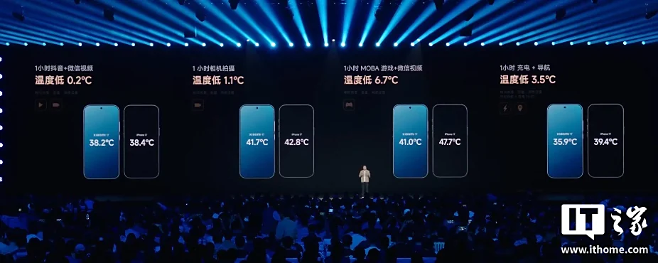 小米 17 手机全球首发高通第五代骁龙 8 至尊版处理器,配有立体环形冷泵散热系统(3 倍传统 VC 性能),宣称相比 iPhone 17 在散热能力方面更强。