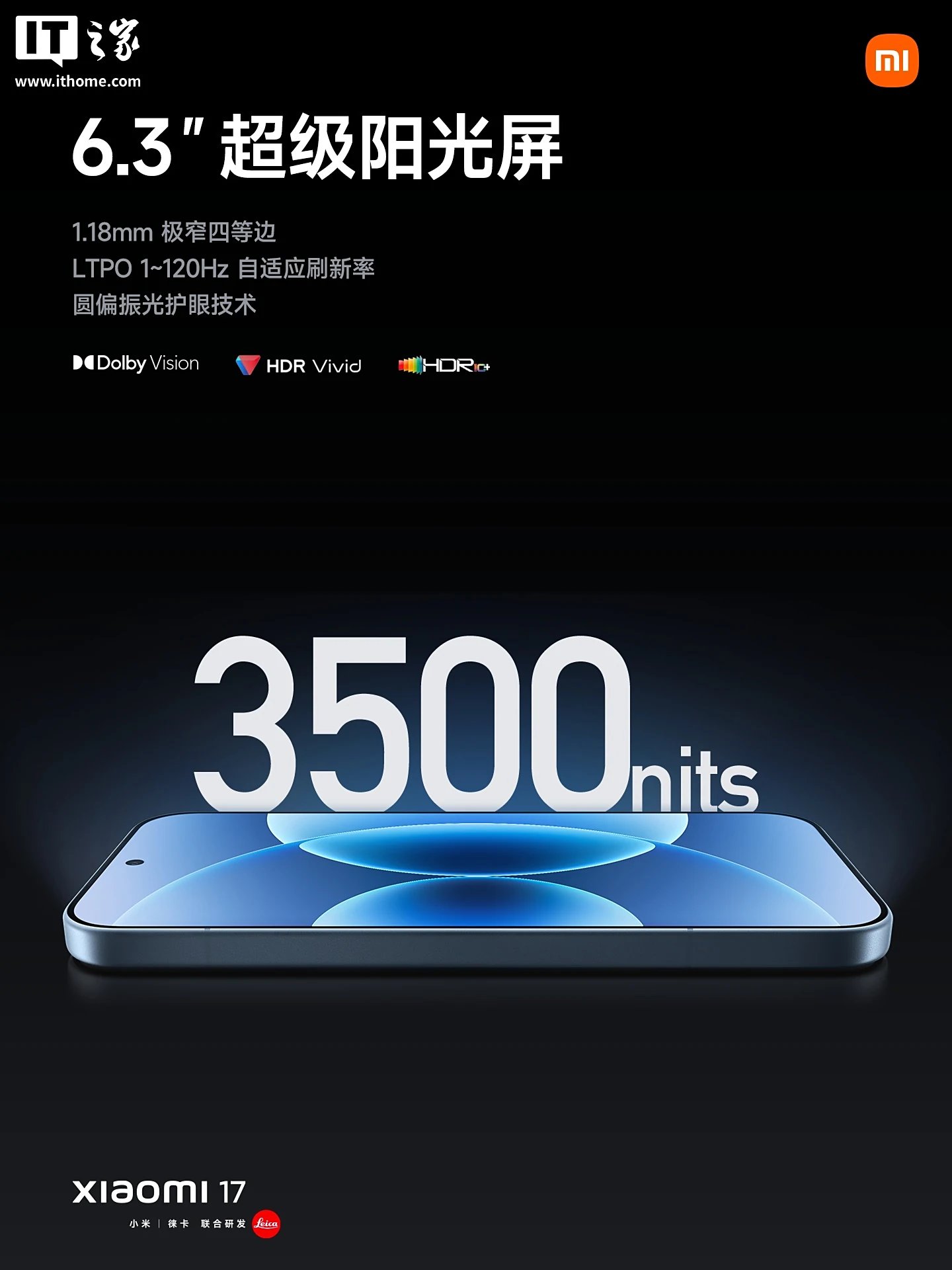 小米 17 的屏幕支持 3500 尼特峰值亮度,采用新一代 M10 屏幕发光技术体系,新型红色发光主材的发光效率提升 11.4%,国产发光材料的发光效率首次实现国际领先。