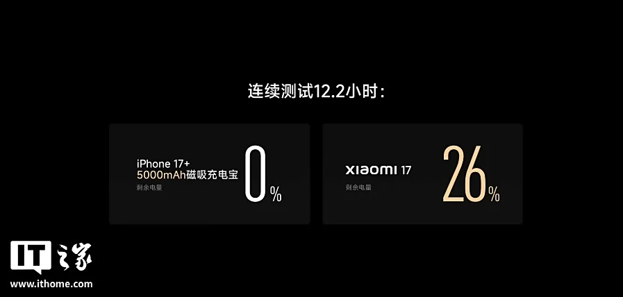 小米 17 还配备了一块 7000mAh 电池,官方实测连续刷 12.2 小时短视频,比 iPhone 17 + 5000mAh 磁吸充电宝的续航还要长。