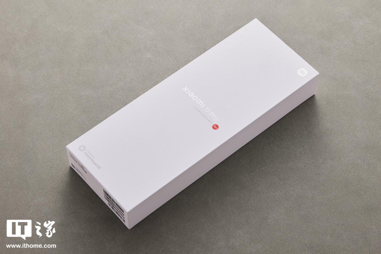 由于小米 17 Pro 系列的双 Pro 机型在外观设计语言上差别不大,所以这里我们先主要以小米 17 Pro 为主进行介绍。IT之家拿到的这款为黑色款,不过包装还是白色的,长方体设计,不过相比普通的手机盒拉长了一些,表面是烫印的银色“xiaomi 17 Pro”Logo,红色徕卡标识很醒目。