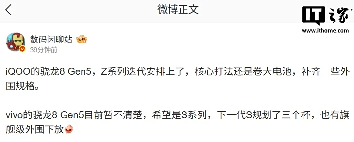 IT之家 9 月 26 日消息,博主 @数码闲聊站 今日爆料称,iQOO Z 系列迭代(预计指 iQOO Z11 系列)安排上的骁龙 8 Gen5 处理器,核心打法还是卷大电池,补齐一些外围规格。vivo 的骁龙 8 Gen5 目前暂不清楚,希望是 S 系列,下一代 S 规划了三个杯,也有旗舰级外围下放。