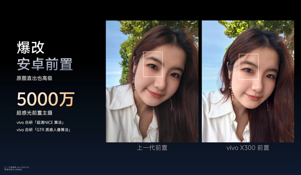 vivo X300 系列的前置摄像头搭载 50MP 传感器,焦段从 24mm 变为 20mm,视角更广,还搭载 vivo 自研 NICE 算法、GTR 质感人像算法。