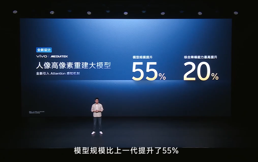 vivo X300 系列搭载 vivo 与联发科联合研发的人像高像素重建大模型,达亿级参数、30T 算力需求,人像模式支持全焦段 50MP 高像素。