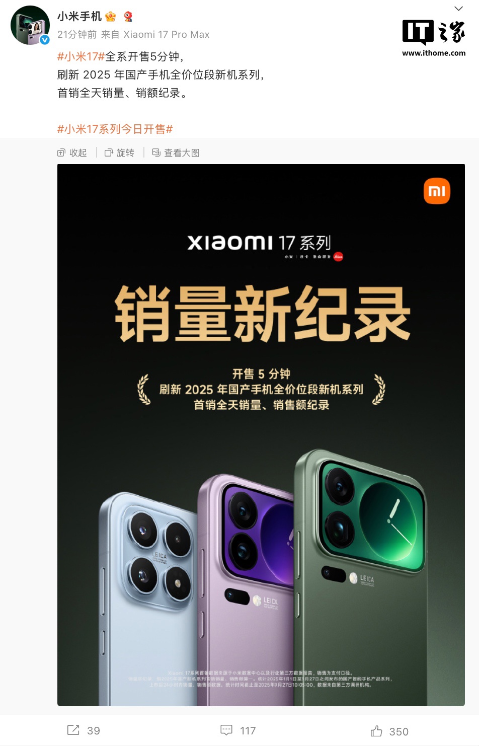 IT之家 9 月 27 日消息,小米 17 / Pro / Pro Max 手机于今天 10 点首销,定价为 4499 元起,据小米手机官方微博,系列机型(全系)开售 5 分钟,刷新 2025 年国产手机全价位段新机系列“首销全天销量、销额纪录”。