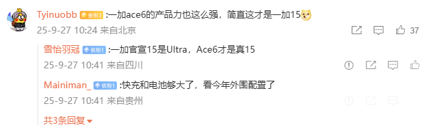 今年 9 月,该博主又表示一加 15 和一加 Ace 6 两款新机将“双箭齐发”。其中数字系列定位「性能 Ultra」,思路类似影像 Ultra,把空间全部用在性能、散热、触控等模块并榨到极致;Ace 系列这代是满血满配,核心体验对标竞品 Pro。