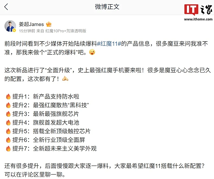 IT之家注意到,红魔游戏手机产品总经理姜超 9 月 4 日“正式爆料”红魔 11 手机,称这次新品进行了全面升级,是“史上最强红魔手机”,很多用户心心念念已久的配置这次都有了。