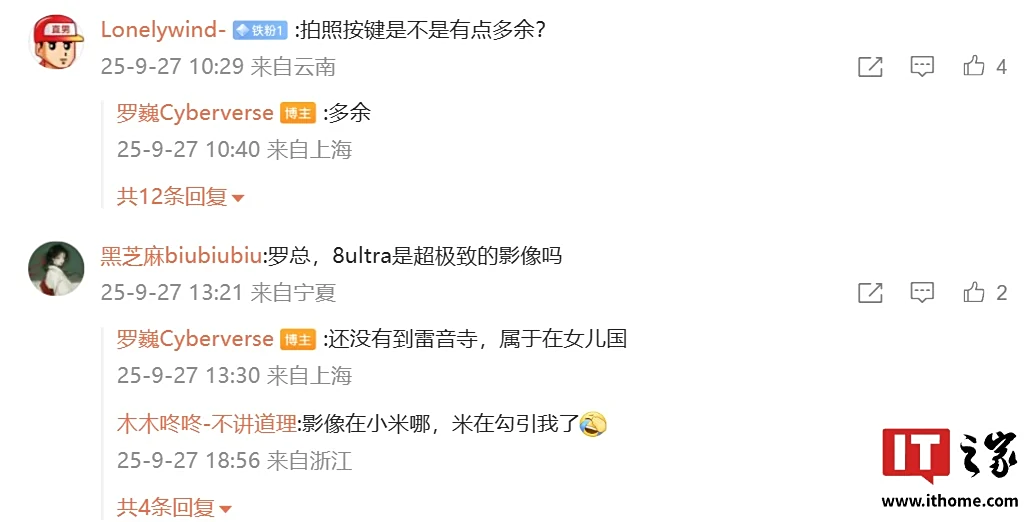 罗巍还在评论区回复了网友的部分问题:针对拍照按键是不是有点多余?,他表示赞同“多余”;针对荣耀 Magic8 Ultra 是超极致的影像吗?他回复“还没有到雷音寺,属于在女儿国”。
