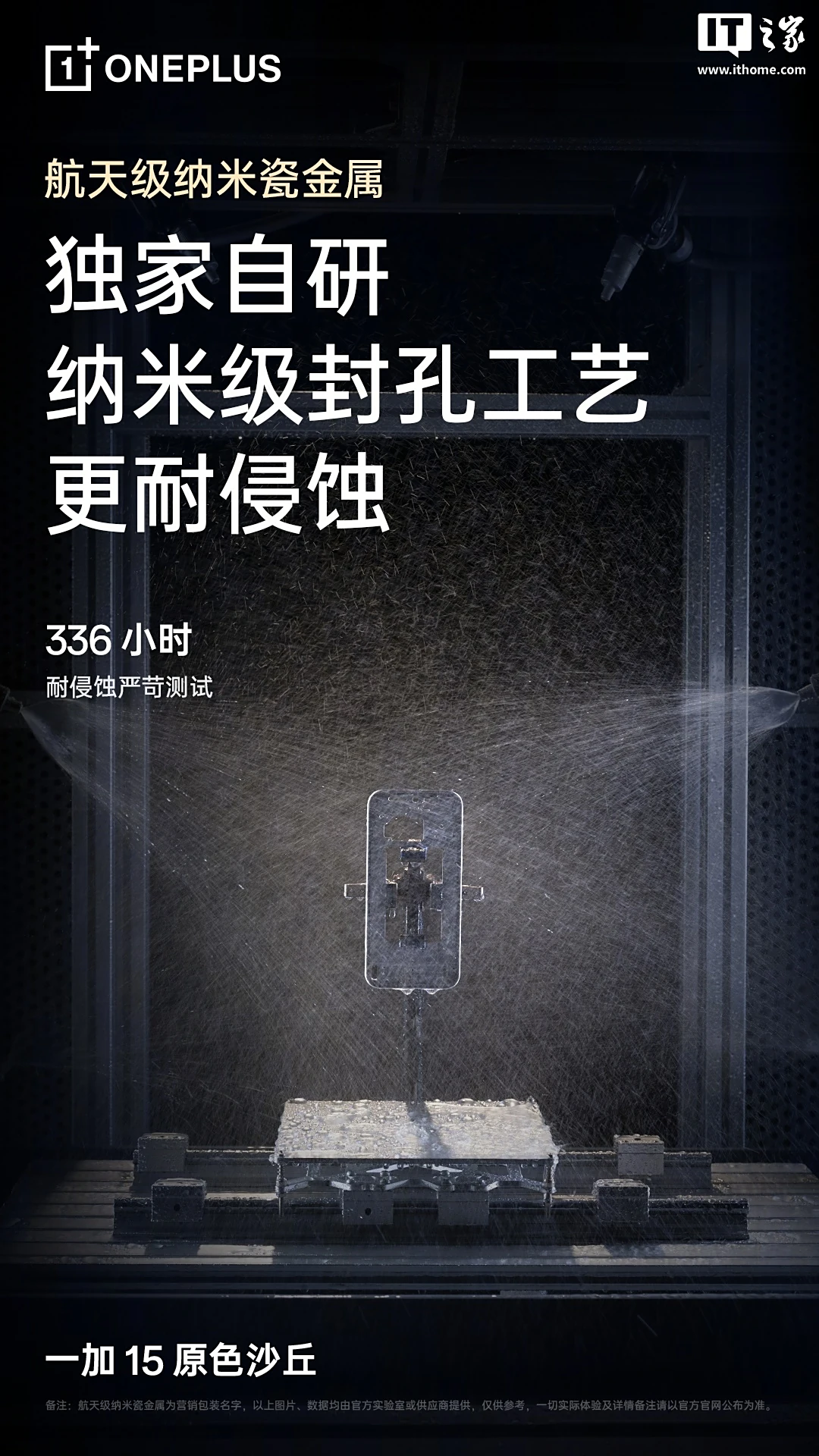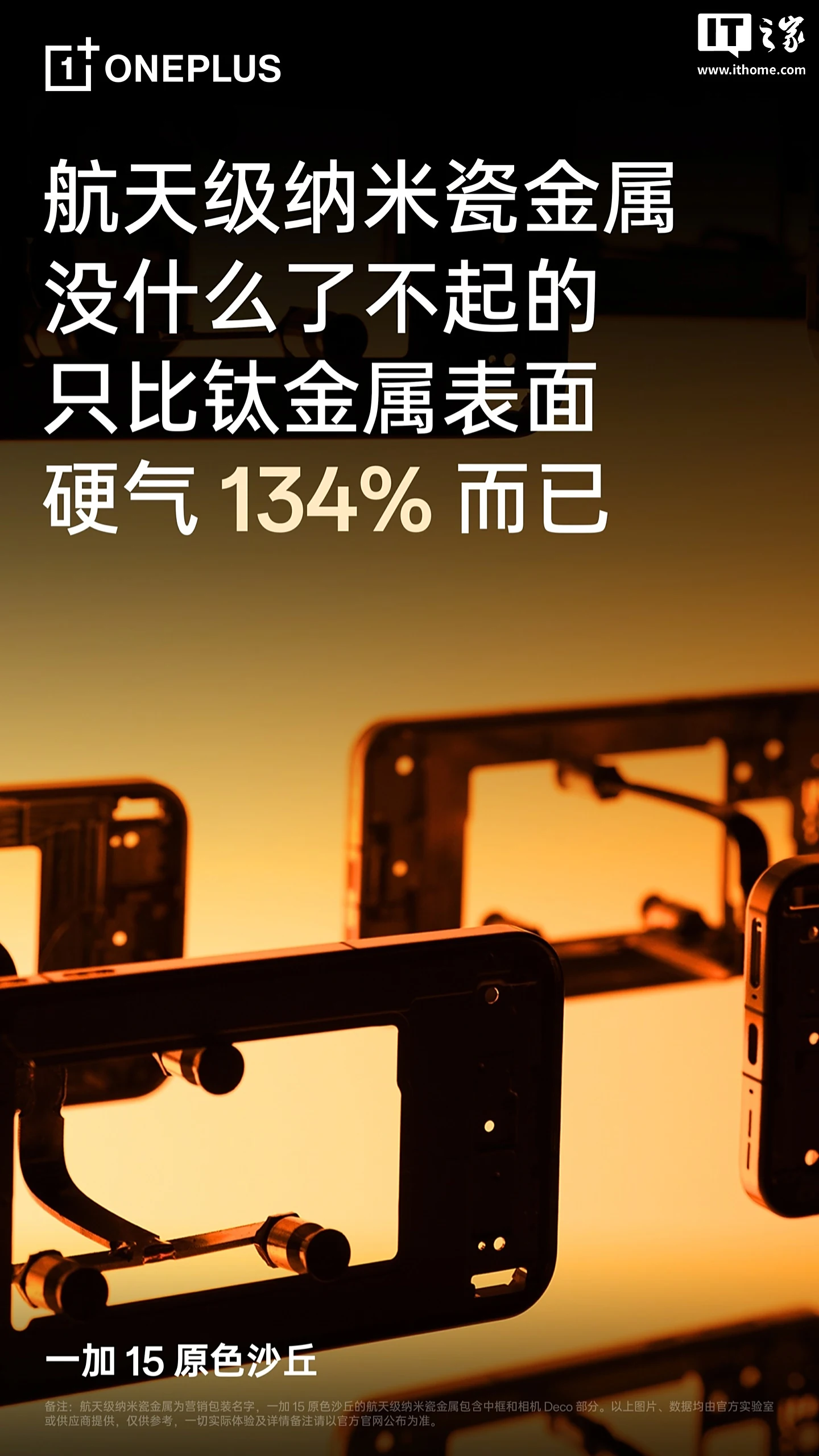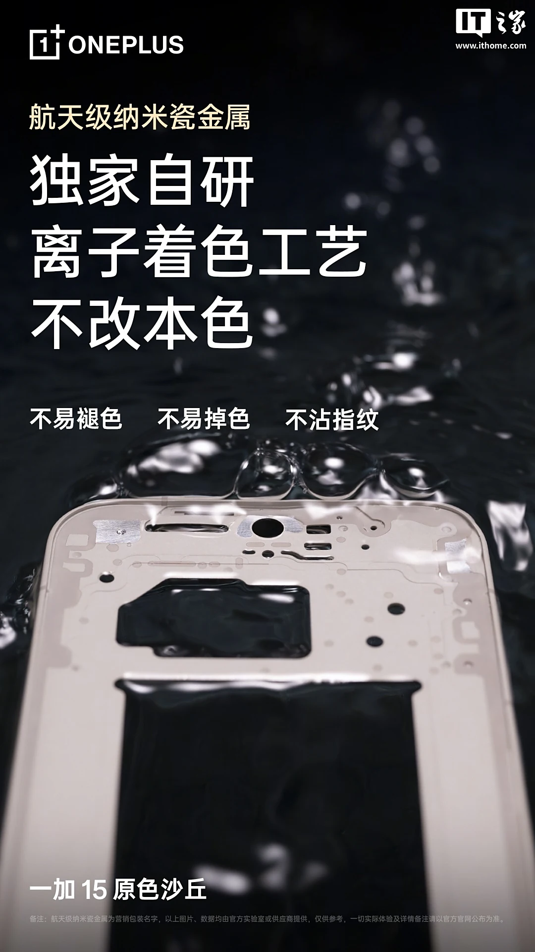 据IT之家今日早些时候报道,一加 15「原色沙丘」配色将首发「航天级纳米瓷金属」中框,带来全球领先的三大复杂工艺:军工级的微弧氧化工艺、独家自研的离子着色工艺、独家自研的纳米级封孔工艺,比钛金属更轻盈、更耐磨、散热更出色。