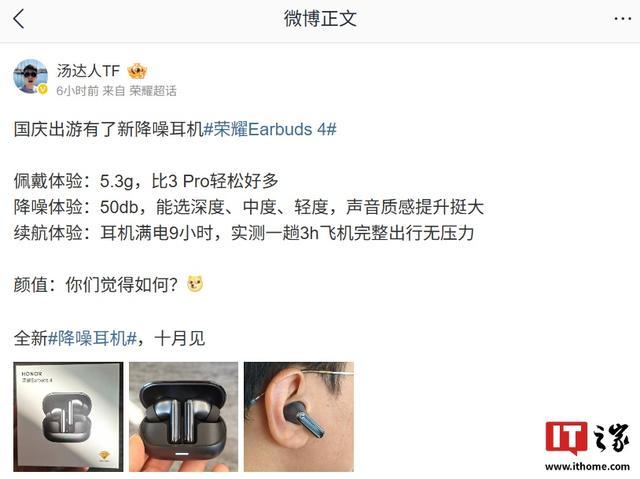 IT之家 9 月 28 日消息,荣耀 GT 系列产品经理 @汤达人TF 今日分享了一款荣耀新品 —— 荣耀 Earbuds 4 无线耳机。