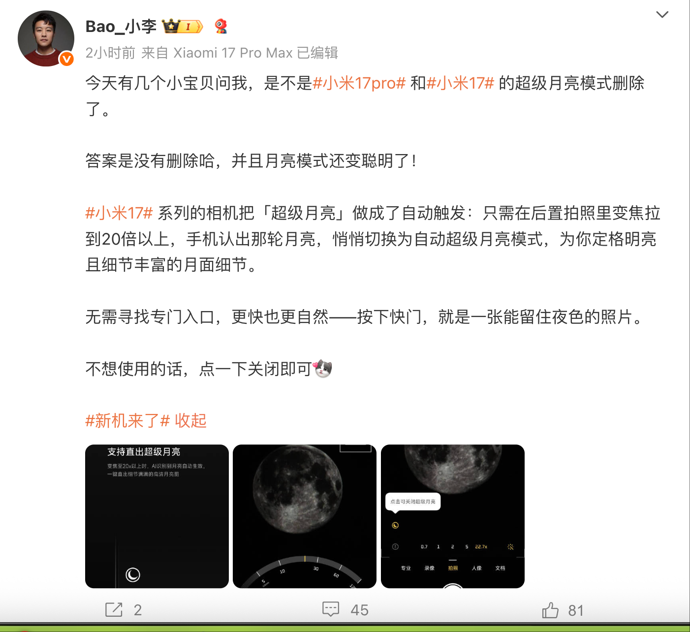 文章来源于互联网:凤凰网-小米17系列手机“超级月亮”模式变聪明了:自动触发、支持直出高清月亮图