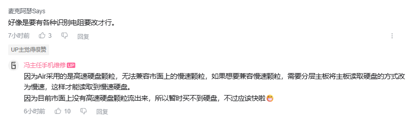 他解释称,之前扩容失败的原因是高速硬盘的兼容性问题。iPhone Air 无论是 256/512GB 还是 1TB NAND 都属于高速硬盘,而目前市面上能买到的都是低速硬盘。