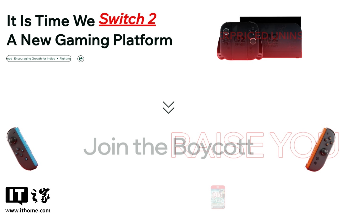 该网站写道:“是时候‘切换’(SWITCH,双关 Switch 主机)到新的游戏平台了”,并呼吁访客不要支持任天堂,转而将购买力投向其他游戏设备选择。