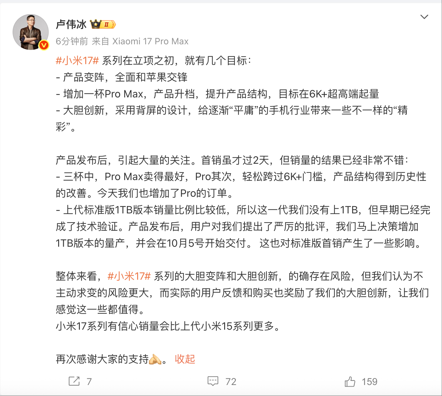 文章来源于互联网:凤凰网-卢伟冰:小米17标准版增加1TB版本 10月5日开始交付