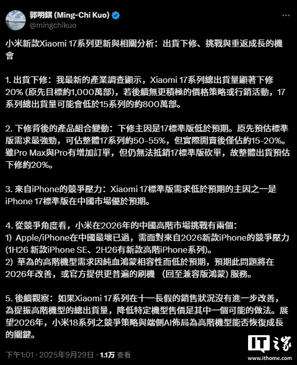 郭明錤称,小米 17 标准款表现不佳的一个关键原因是苹果 iPhone 17 标准款在中国市场的销量强于预期。