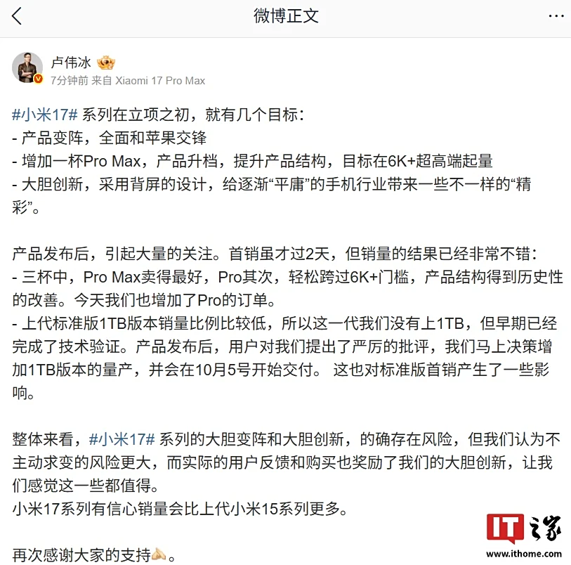 IT之家 9 月 29 日消息,小米公关负责人王化今日发文称,目前没有任何削减订单的计划,因为新增了小米 17 标准版的 16GB+1TB 版本,加之 17 Pro 系列加单,产品的结构配比会发生改变,整体的产品订单会较上一代增加