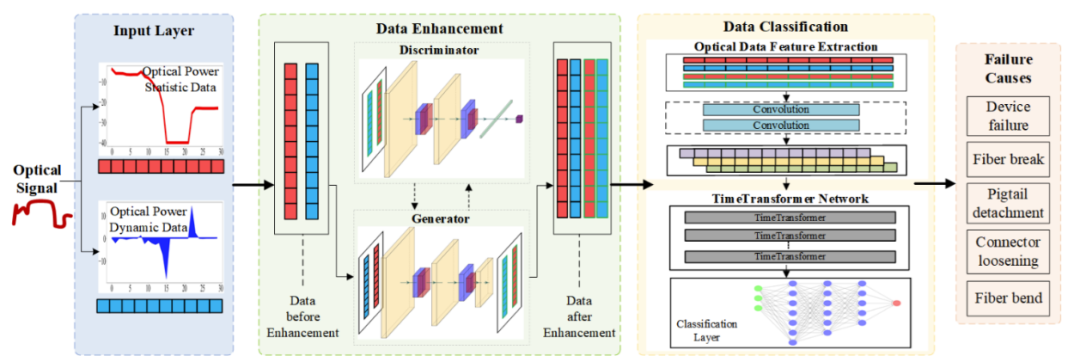 第三,设计动静态特征耦合分类算法。深入研究光网络故障光功率的瞬态变化规律,研发区别于业界通用分类算法的双注意力神经网络,可同时提取光功率信号的动态与静态特征。与传统支持向量机、随机森林等算法相比,故障识别准确率提升超过 14.7%。