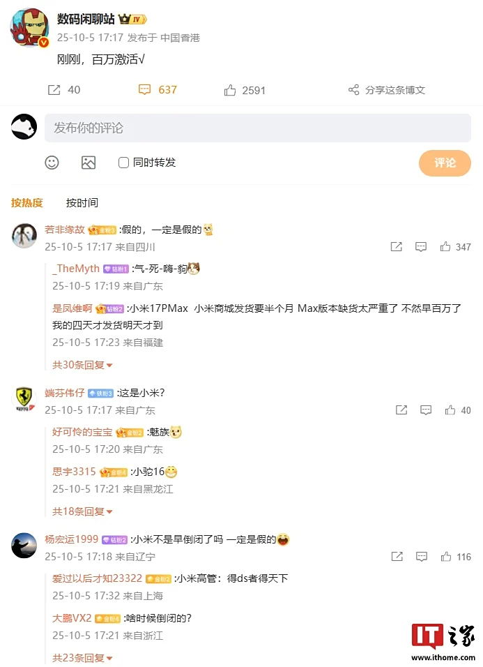IT之家 10 月 5 日消息,博主 @数码闲聊站 刚刚发文“刚刚,百万激活√”,暗指某厂商手机的激活量达到百万。结合评论区讨论来看,博主所指的机型预计为小米 17 系列。