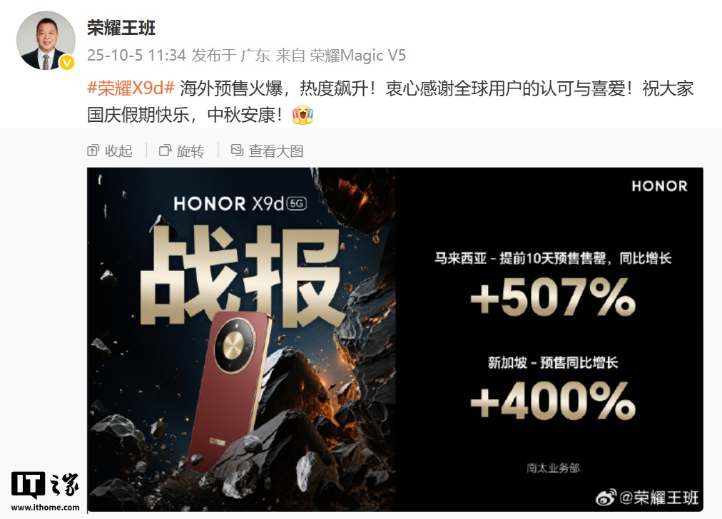 IT之家 10 月 5 日消息,荣耀终端股份有限公司销售与服务总裁王班今日发文分享了荣耀 X9d 手机的海外预售成绩,他透露新机“海外预售火爆,热度飙升”:马来西亚市场提前 10 天预售售罄,同比增长 507%;新加坡预售同比增长 400%。