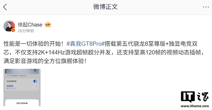 IT之家 10 月 6 日消息,realme 副总裁徐起今日发文称,真我 GT8 Pro 搭载第五代骁龙 8 至尊版 + 独显电竞双芯,不仅支持 2K+144Hz 游戏超帧超分并发,还支持至高 120 帧的视频动态插帧,满足影音游戏的全方位旗舰体验。