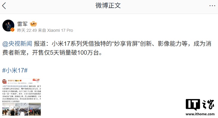 IT之家 10 月 6 日消息,央视新闻昨日报道,小米 17 系列手机开售仅 5 天销量破 100 万台,雷军本人进行了转发确认。