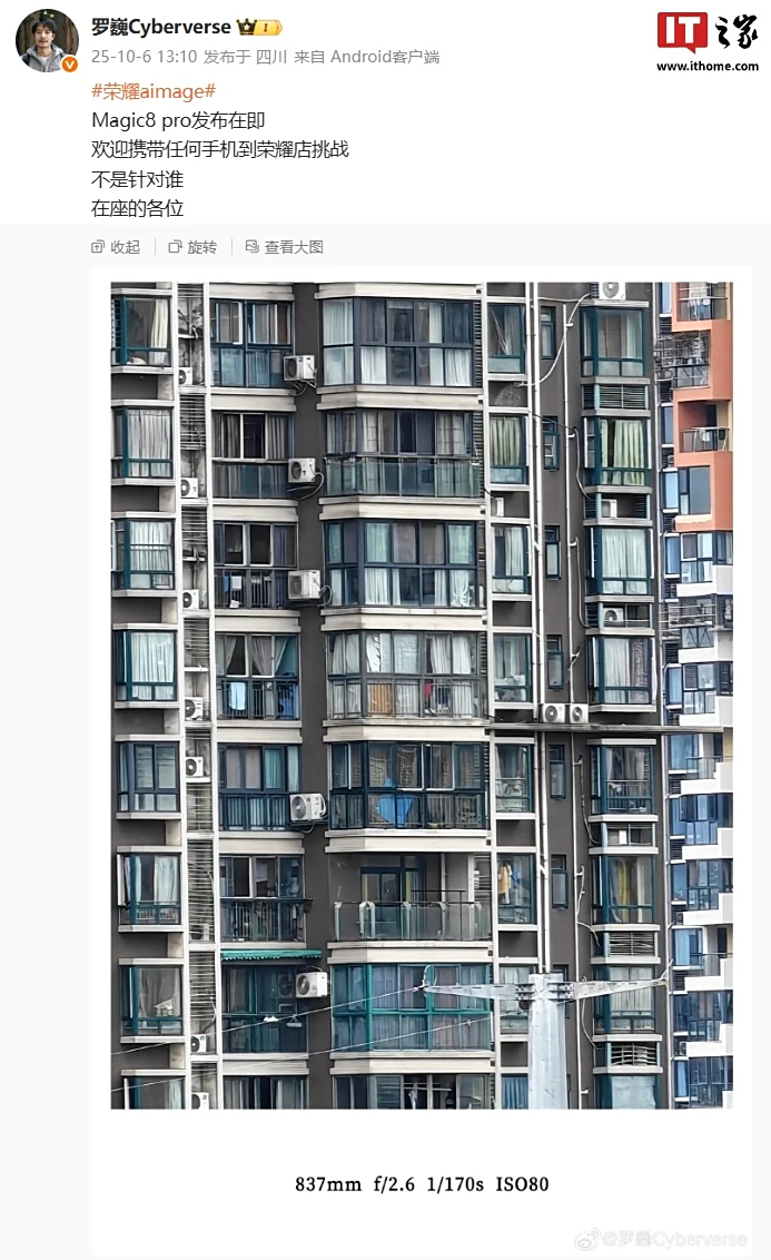 IT之家 10 月 6 日消息,荣耀首席影像工程师罗巍今日发文称,Magic8 Pro 发布在即,欢迎携带任何手机到荣耀店挑战。他表示“不是针对谁 在座的各位”。值得一提的是,罗巍微博的话题为“荣耀 aimage”,暗指荣耀 Magic8 Pro 手机在影像上有所突破。