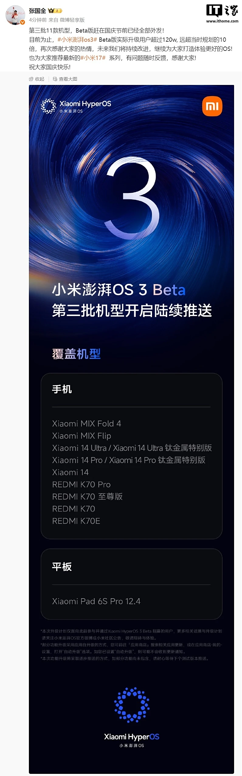 据IT之家此前报道,小米手机系统软件部总监张国全在 9 月 30 日发文称,小米澎湃 OS 3 Beta 第三批 11 款机型,Beta 版赶在国庆节前已经全部外发。张国全透露,小米澎湃 OS 3 Beta 版实际升级用户超过 120 万,远超当时规划的 10 倍。