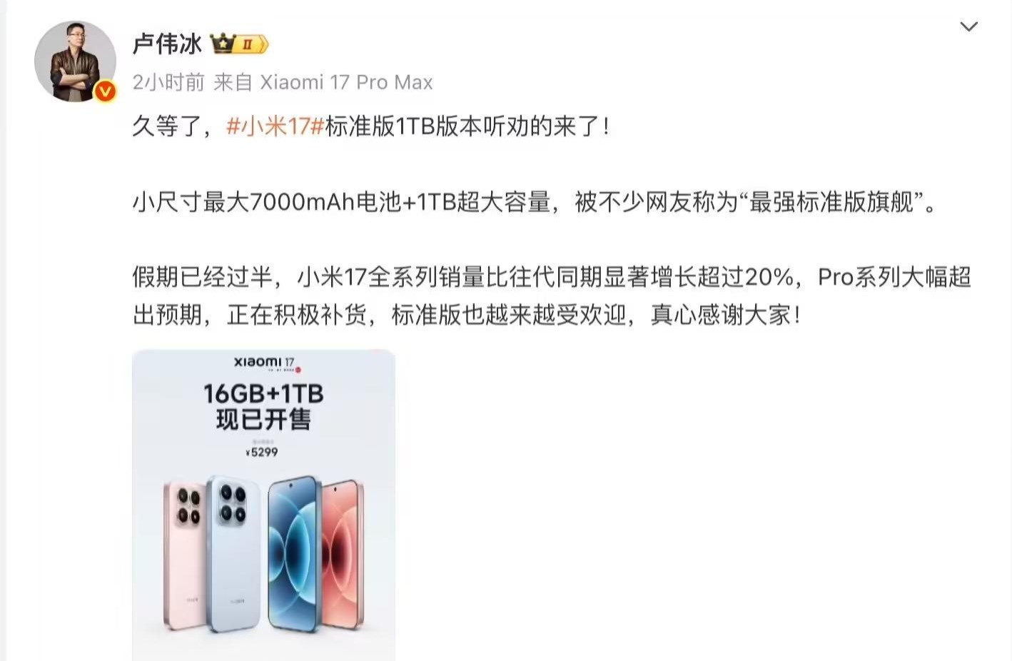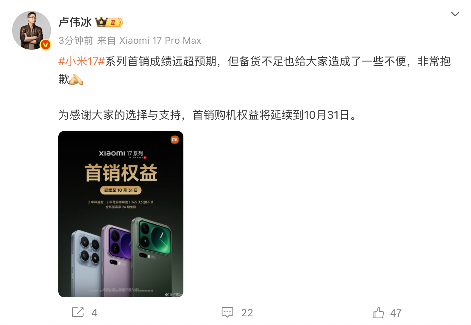 文章来源于互联网:凤凰网-卢伟冰:小米17系列首销成绩远超预期 购机权益将延续到10月31日