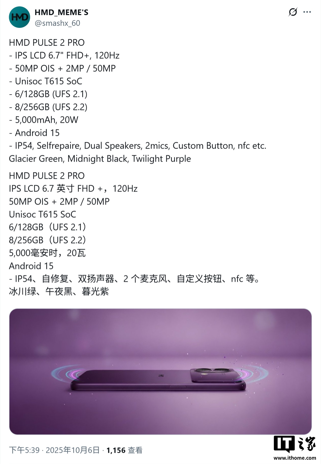 IT之家 10 月 7 日消息,消息源 @smashx_60 今天(10 月 7 日)在 X 平台发布推文,曝料称 HMD Global 将推出 HMD Pulse 2、HMD Pulse 2+、HMD Pulse 2 Pro 三款机型,并分享了 HMD Pulse 2 Pro 机型的核心规格参数。