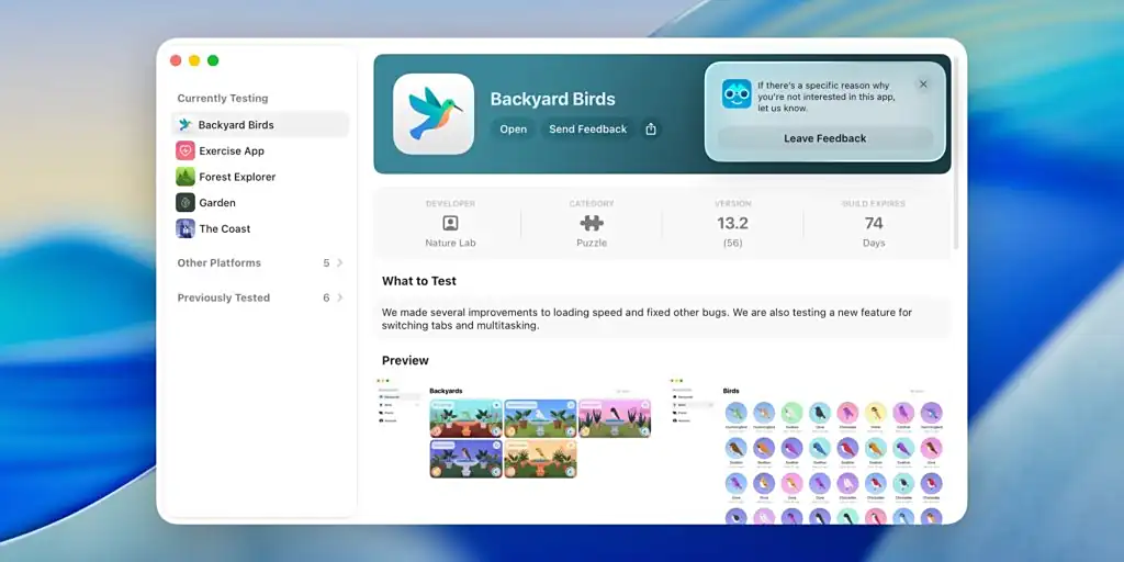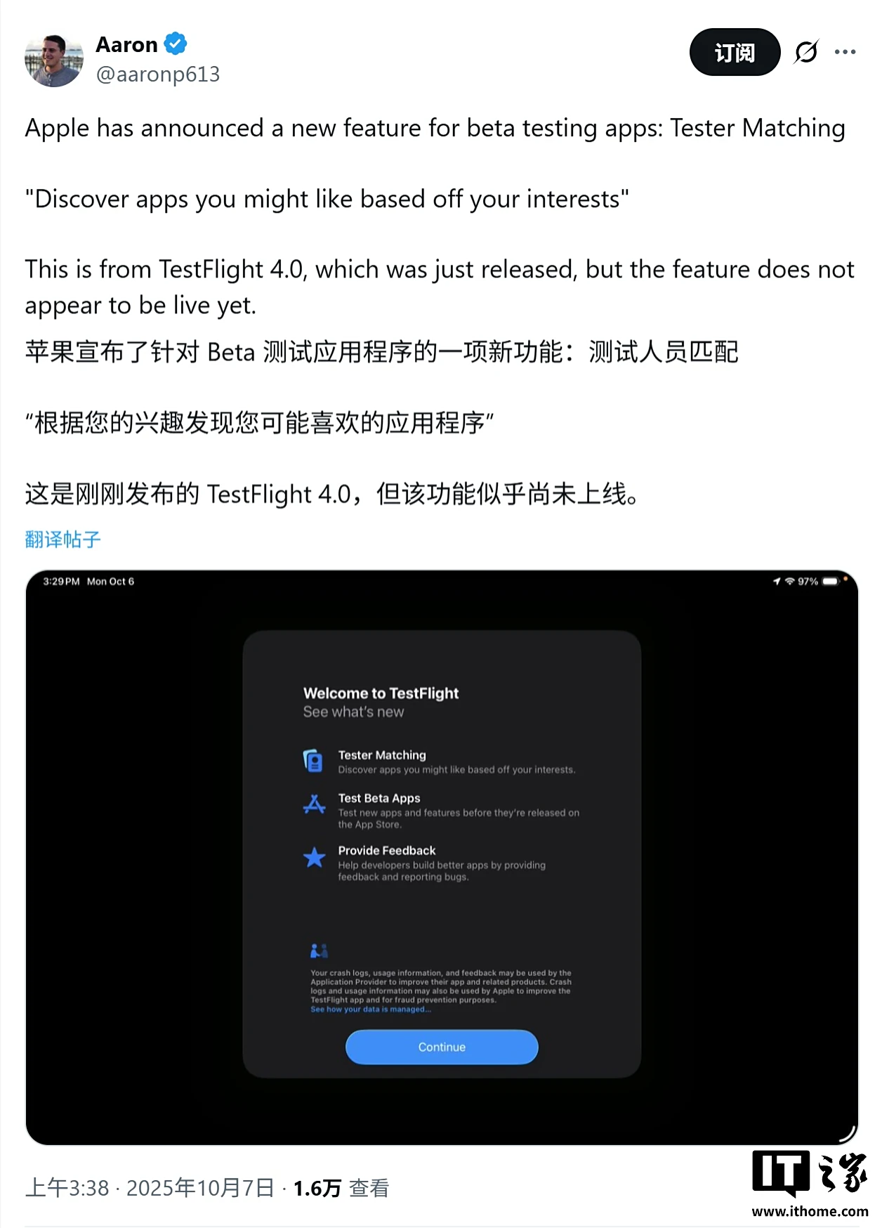 IT之家援引博文介绍,TestFlight 还迎来了一项重要的功能性升级。应用内新增了一个名为“测试者匹配”(Tester Matching)的实验性功能,系统会根据用户的兴趣偏好,主动推荐可能感兴趣的测试版应用。