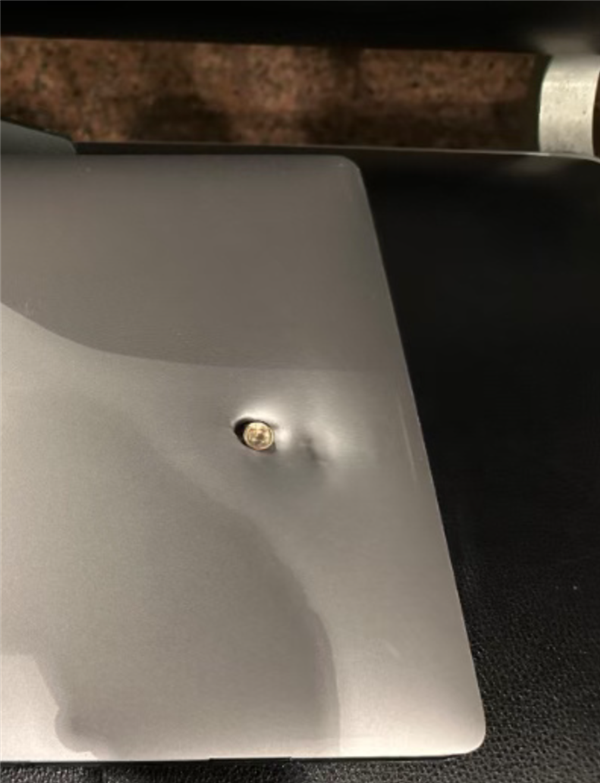 在警局做完笔录后,他打车赶往机场,安检时发现,用了五年的笔记本电脑中弹了: