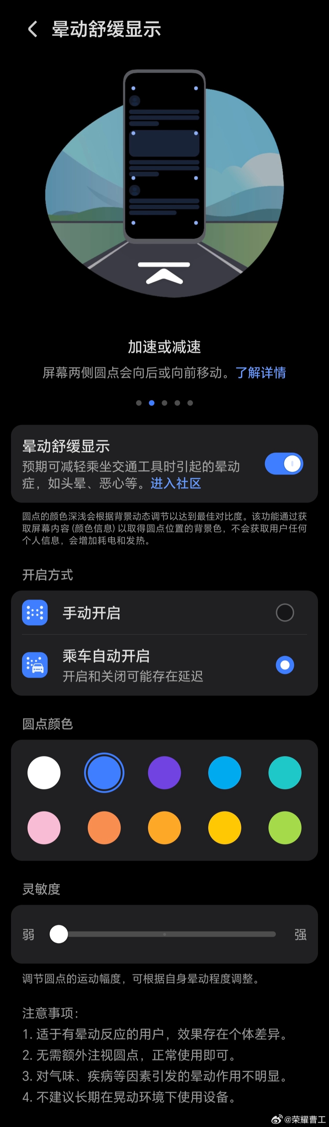 文章来源于互联网:IT之家-荣耀 MagicOS 10.0 系统将支持「晕动舒缓显示」乘车自动开启、自定义颜色等特性