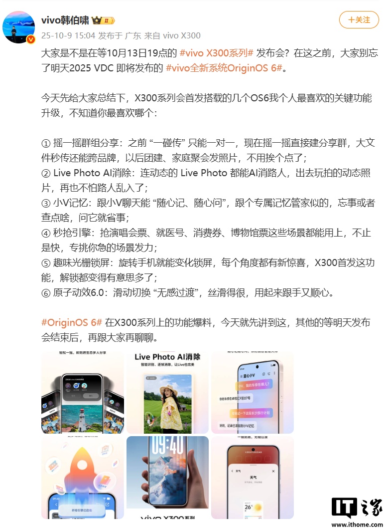 IT之家 10 月 9 日消息,vivo 产品经理韩伯啸今天汇总了全新 OriginOS 6 系统的升级要点,主打原子动效 6.0“无感过渡”滑动切换及动态照片 Live Photo AI 消除等,增加了多种实用功能
