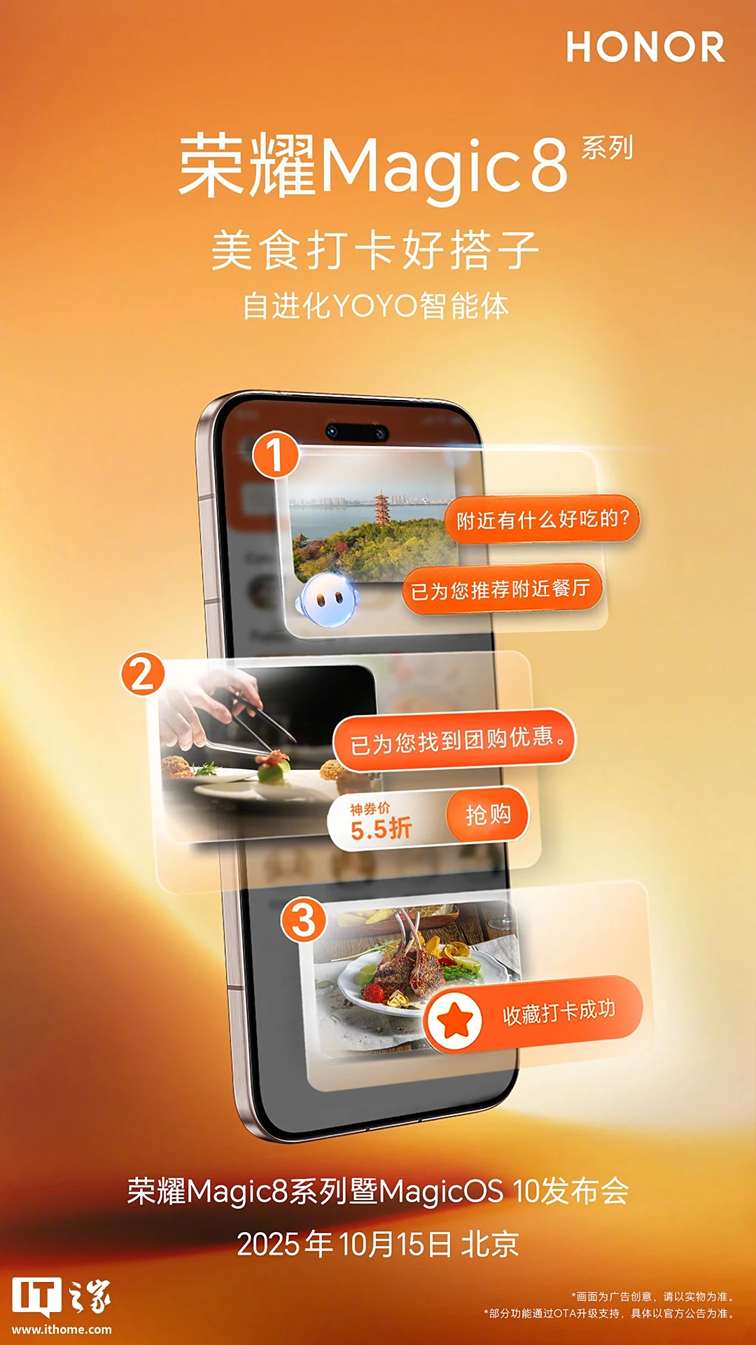 此外,荣耀 Magic8 系列手机的自进化 YOYO 智能体可一键搞定打卡美食“选店 → 找团购 → 收藏打卡 → 餐后点评”的全流程。