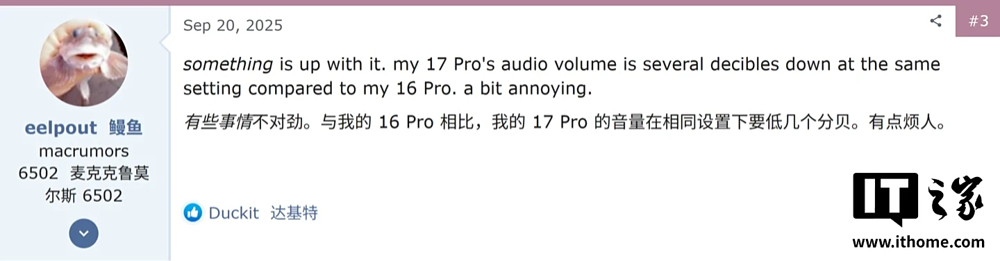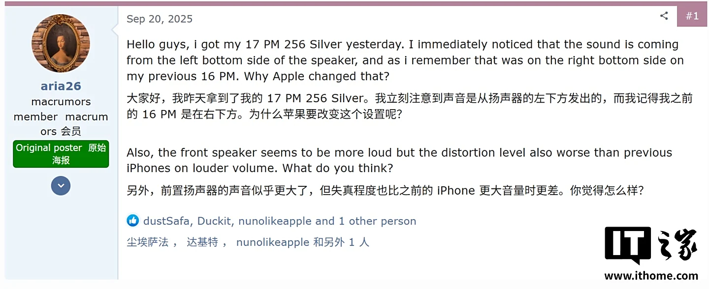 根据 Apple 支持论坛、MacRumors 论坛以及 Reddit 社区部分用户反馈,受影响用户反馈扬声器异常,CNET 分析师 Jeffrey Mizrahi 称,他的 iPhone 17 Pro Max 上的音频听起来比之前的 iPhone 16 Pro Max 更“清脆”,在听 John Oliver YouTube 视频中的对话时,他注意到声音有些失真。