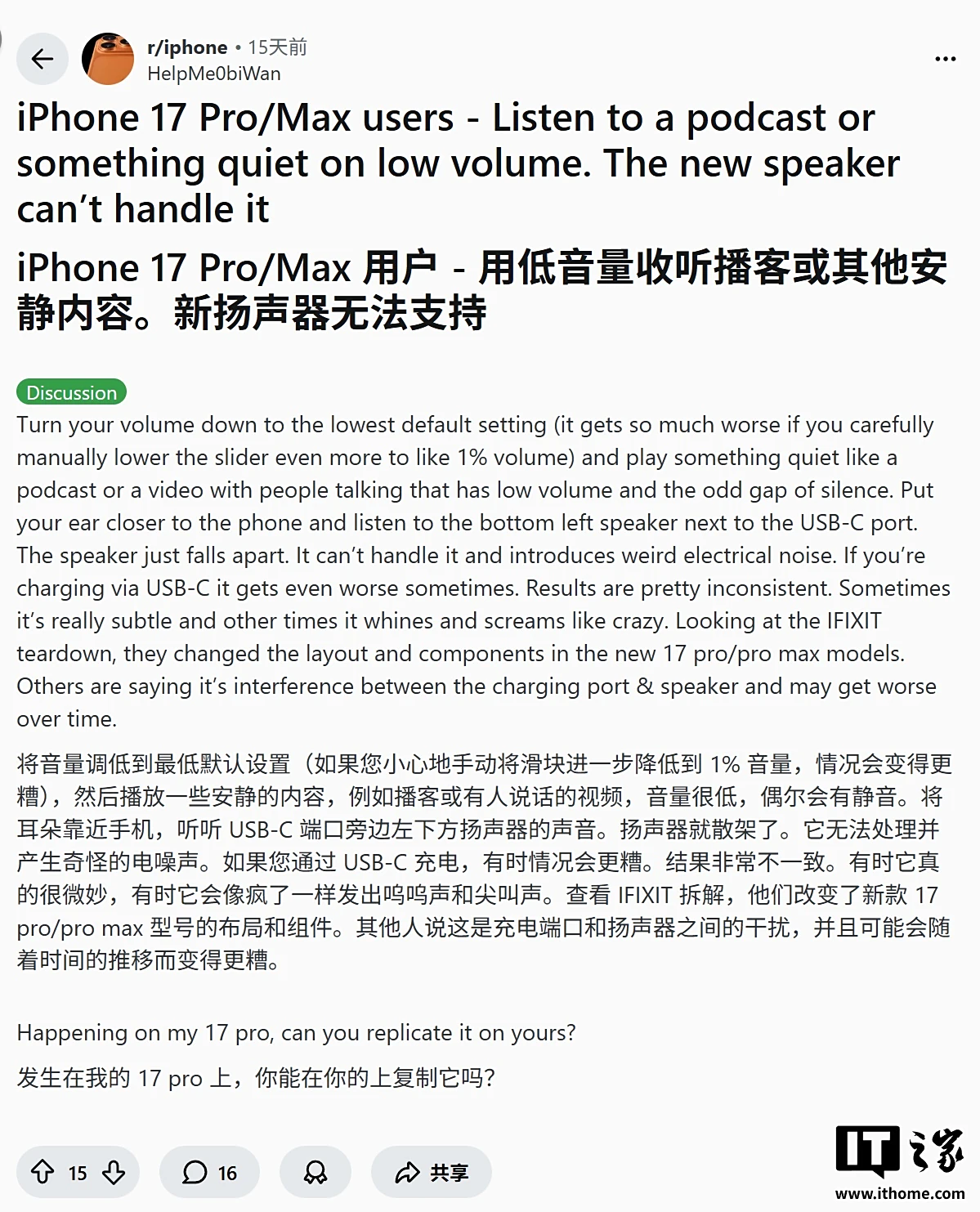 IT之家 10 月 9 日消息,科技媒体 CNET 昨日(10 月 8 日)发布博文,报道称部分 iPhone 17 Pro Max 用户反馈遇到扬声器问题,具体表现为声音“发脆”、整体音量偏低,以及在通过 USB-C 有线充电且音量为 0% 或者 1% 时,会发出类似“对讲机”的静电噪音。