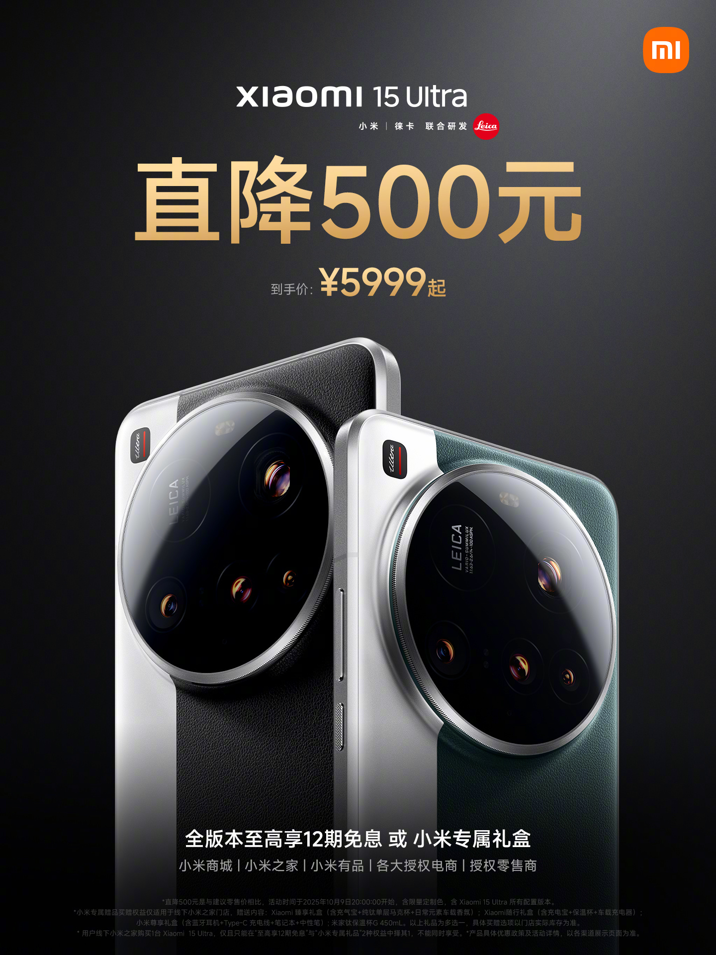 IT之家 10 月 9 日消息,小米手机今晚宣布,小米 15 Ultra 即日起全版本特惠 500 元,到手价 5999 元起,全版本至高享 12 期免息或小米专属礼盒。