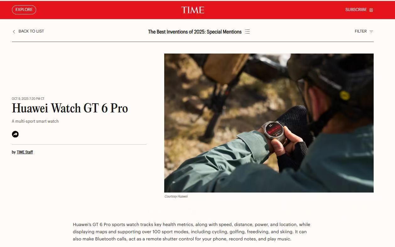 此外,华为Watch GT 6 Pro凭借卓越的运动监测、健康管理与续航创新实力入选特别提名(Special Mention),为中国唯一上榜主流智能穿戴产品,。