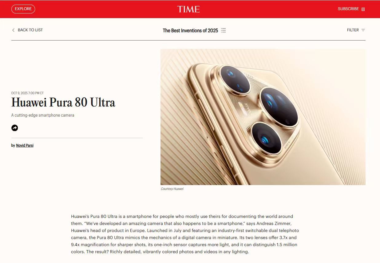 《时代》评价称,Pura 80 Ultra 将“专业相机理念融入手机”,其 可切换式双长焦镜头、高动态捕捉能力与艺术级影像风格,使其“重新定义了移动摄影的边界”。