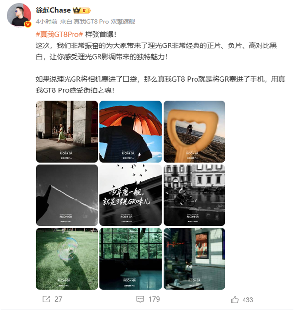 今日,真我realme副总裁、全球营销总裁、中国区总裁徐起首次公布真我GT8 Pro样张,展示了理光GR非常经典的正片、负片、高对比黑白,理光GR味儿拉满。