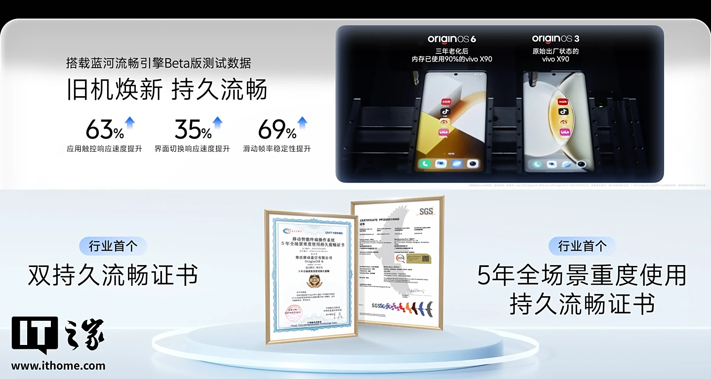 IT之家注意到,vivo 官方以使用三年后搭载蓝河流畅引擎 Beta 版的 X90 为例,跟出厂时搭载 OriginOS 3 的 X90 新机进行对比测试。应用触控响应速度提升 63%,界面切换响应速度提升 35%,滑动帧率稳定性提升 69%。